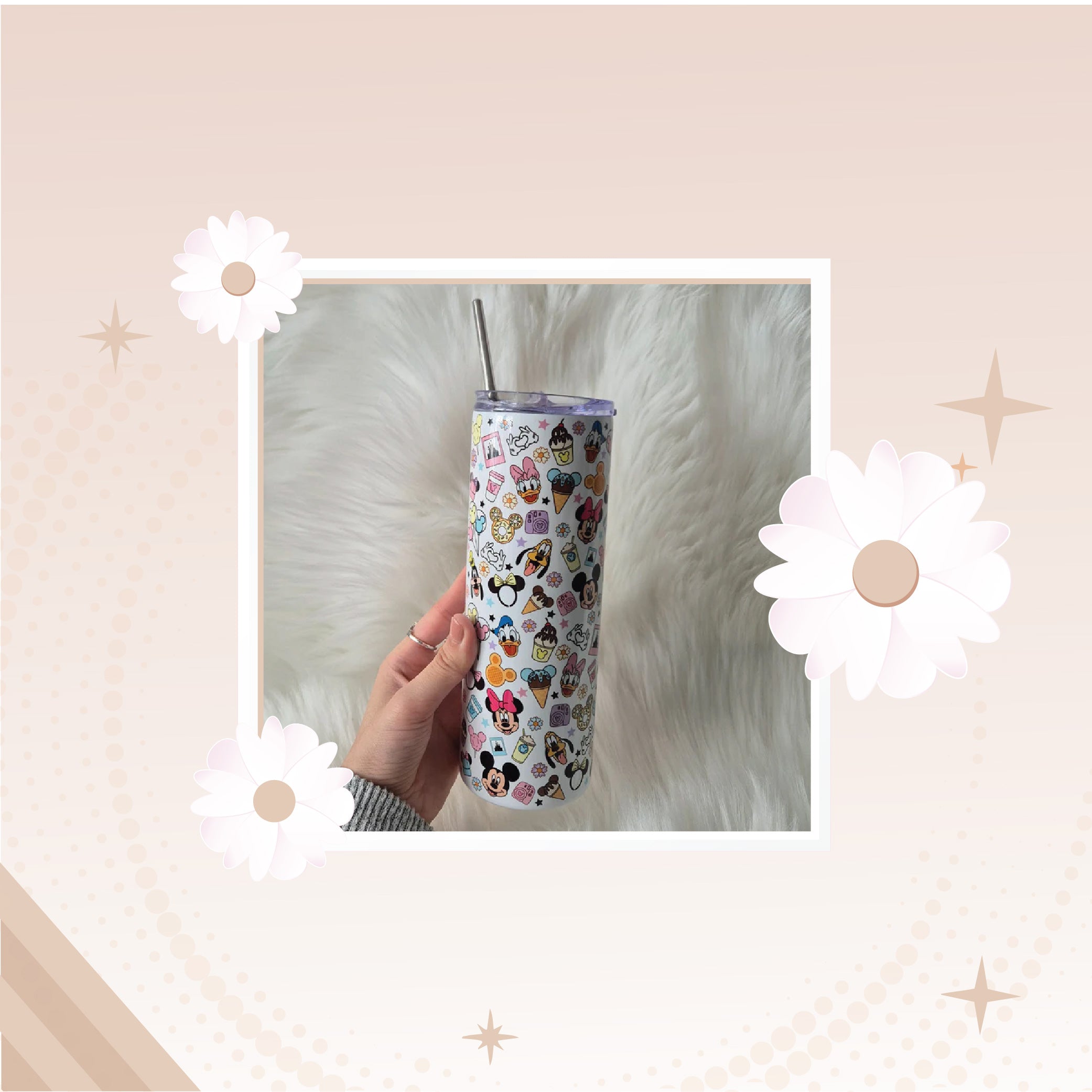 Cute personalised daisy tumbler made from stainless steel with double-wall insulation to keep drinks hot or cold. Includes a BPA-free lid and metal straw — perfect for everyday use or gifting.